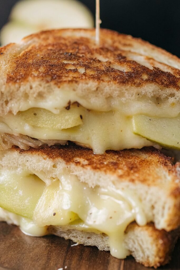 Serve the sandwich warm right after cooking so the brie stays creamy and soft. Cutting the sandwich in half reveals the melted cheese and apple slices layered inside.