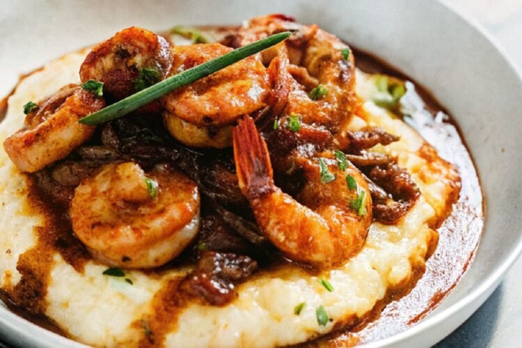 A wide shallow bowl works perfectly for serving shrimp and grits because it holds the creamy base while showing off the shrimp on top. Spoon the shrimp and buttery sauce directly over the warm grits so the sauce flows into the bowl.