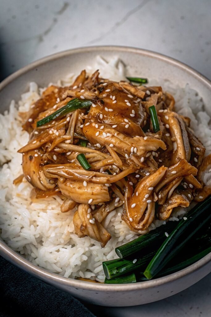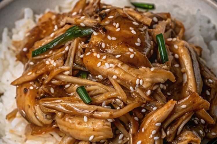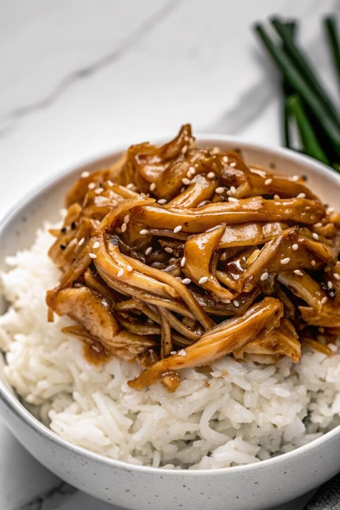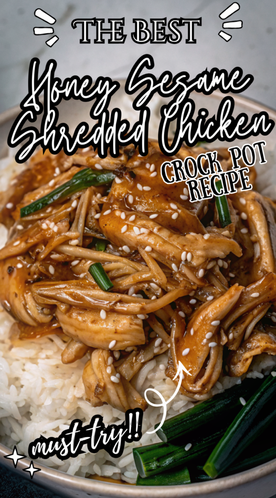This crock pot honey sesame shredded chicken served with fluffy rice or fresh wraps is a complete and delicious meal.