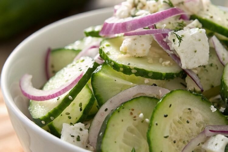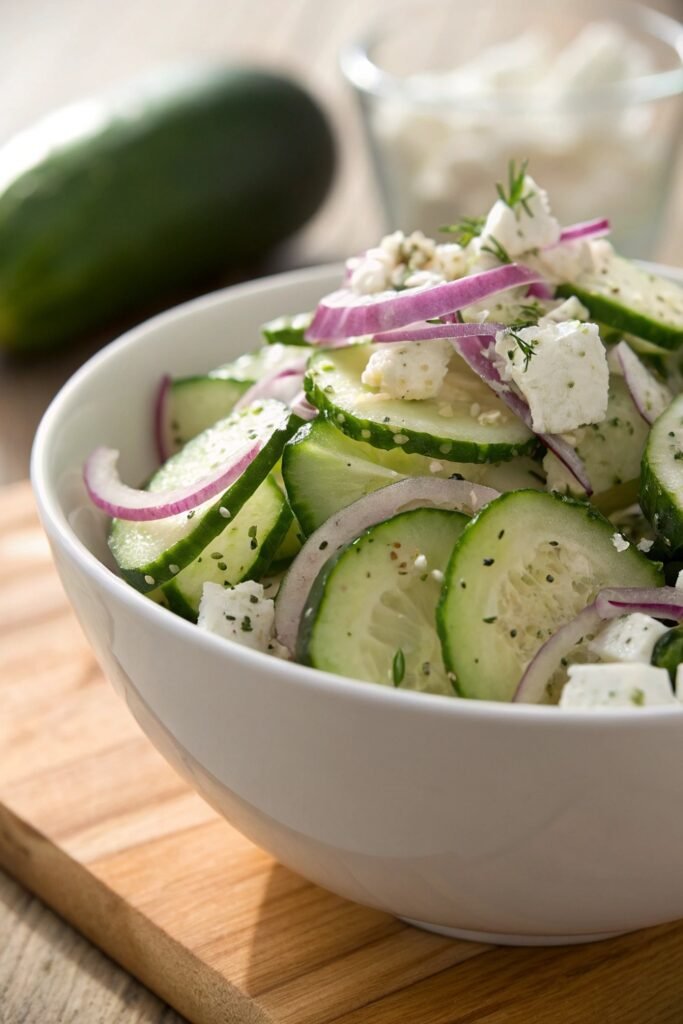 This salad tastes best served cold, straight from the fridge, when the cucumbers are still crisp and the dressing feels bright. I usually bring it to the table in a chilled bowl so it stays refreshing longer.
