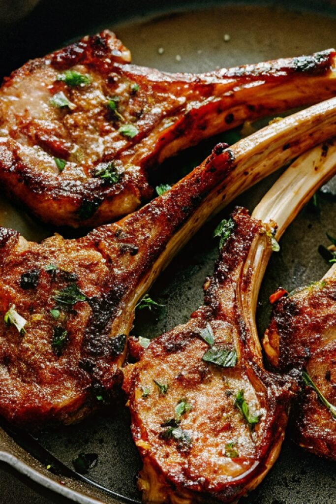 Lay the lamb chops in the pan without crowding. Cook for about three minutes until a deep golden crust forms.