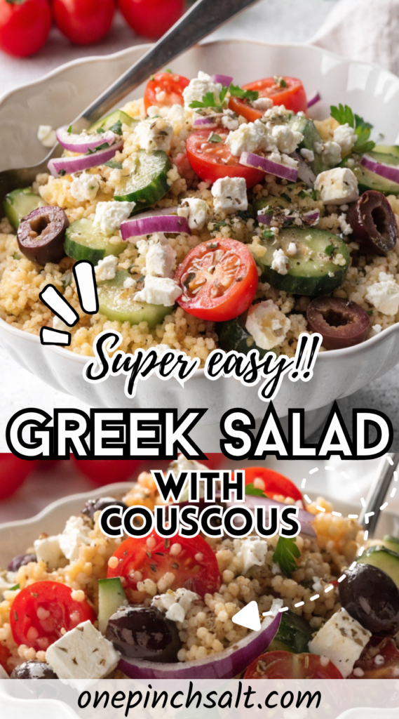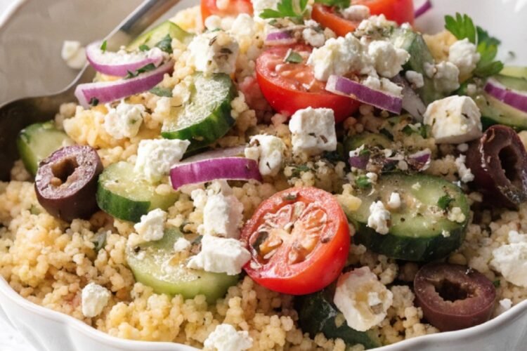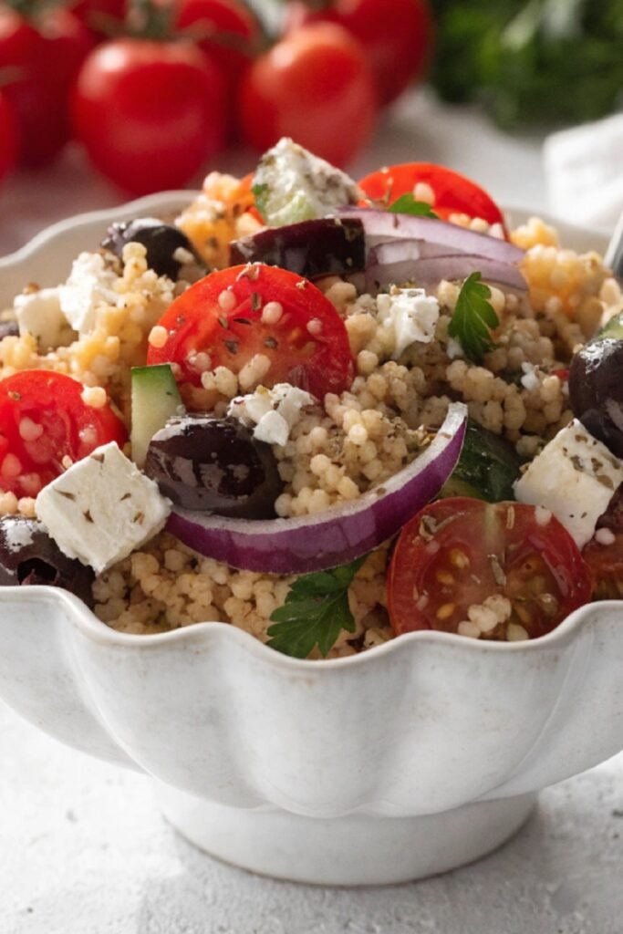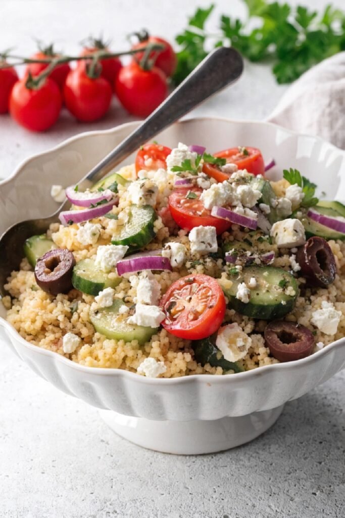 This Greek salad with couscous is the kind of fresh, colorful dish that feels just right for lunch or a light dinner. Serve it as it is for a simple, satisfying meal, or pair it with grilled chicken or warm pita to make it even more filling.