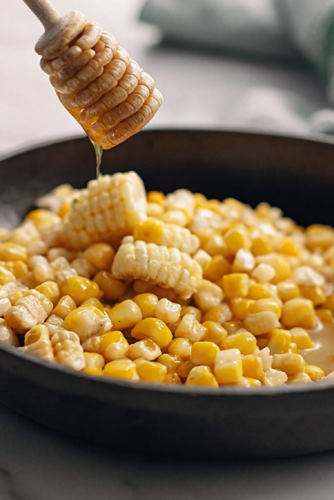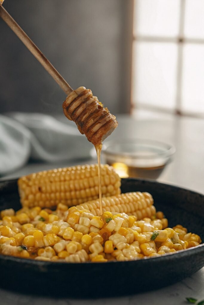 Drizzle honey over the corn and stir well. The heat helps the honey spread and coat each kernel. You will notice the corn starting to look slightly glossy at this stage.