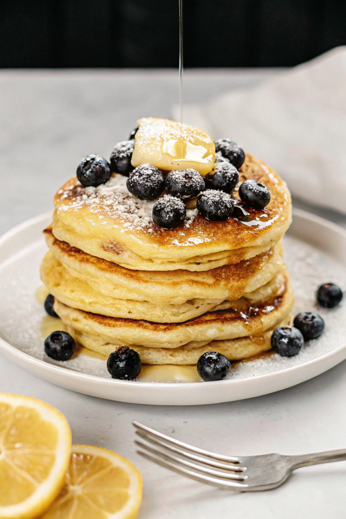 A stack of these pancakes pairs well with a drizzle of honey or maple syrup. The sweetness works nicely with the light citrus flavor and creates a balanced bite.