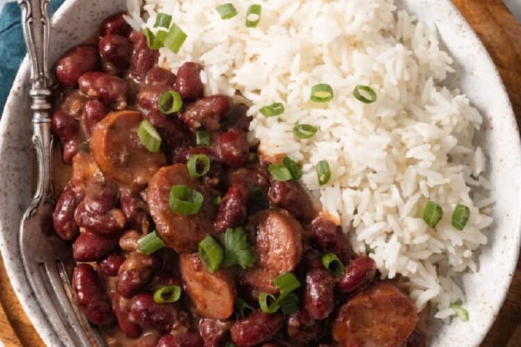This dish works best served warm in a simple bowl where the creamy beans sit right over fluffy rice. It already feels like a full meal on its own since it includes protein, grains, and rich seasoning.