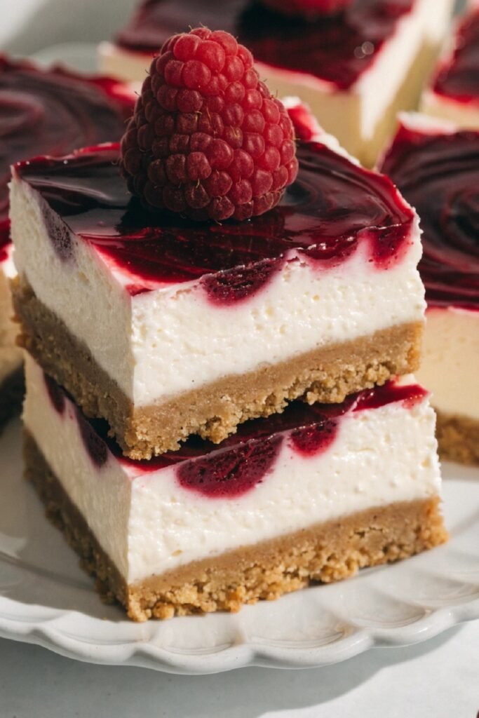 They work nicely as a dessert after meals or as a sweet treat with tea or coffee. The raspberry swirl adds a bright touch that keeps each bite from feeling overly rich.