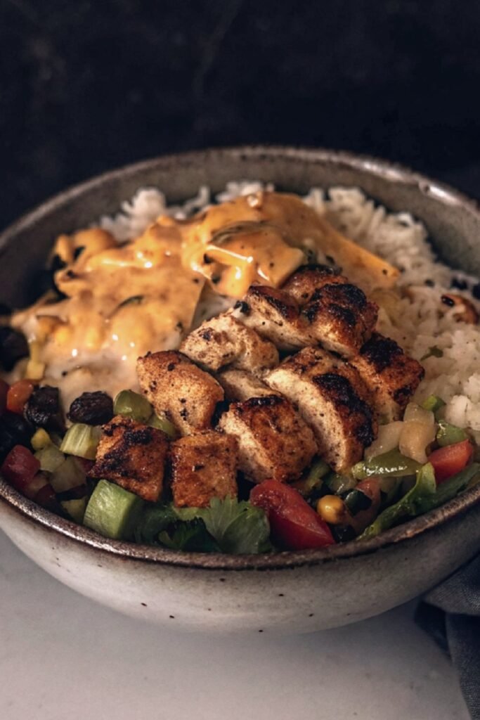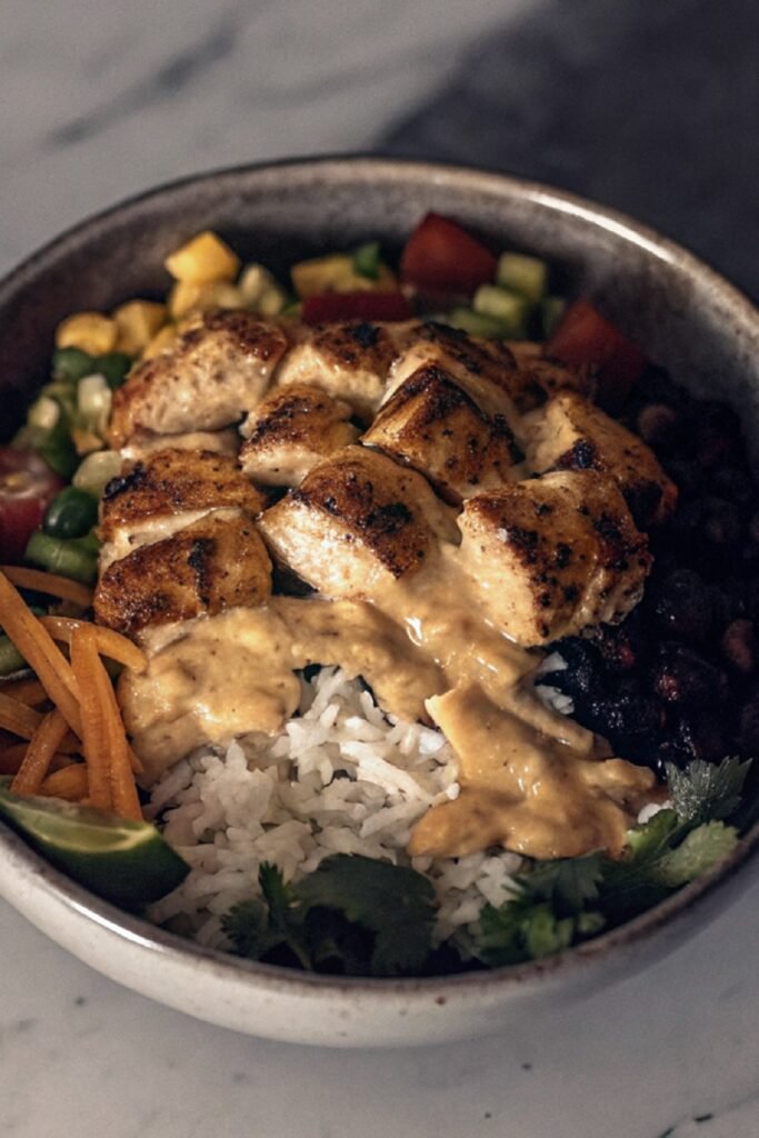 A freshly made bowl works perfectly as it is. The mix of warm chicken, grains, and toppings already creates a full meal that feels balanced and satisfying. I usually enjoy it right after assembling while everything still feels fresh.