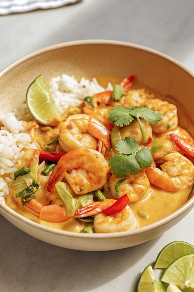 Warm bowls of steamed rice make the perfect base for this curry. The rice absorbs the creamy sauce and helps balance the spice. Spoon the shrimp and vegetables over the top and make sure plenty of sauce goes into each bowl.