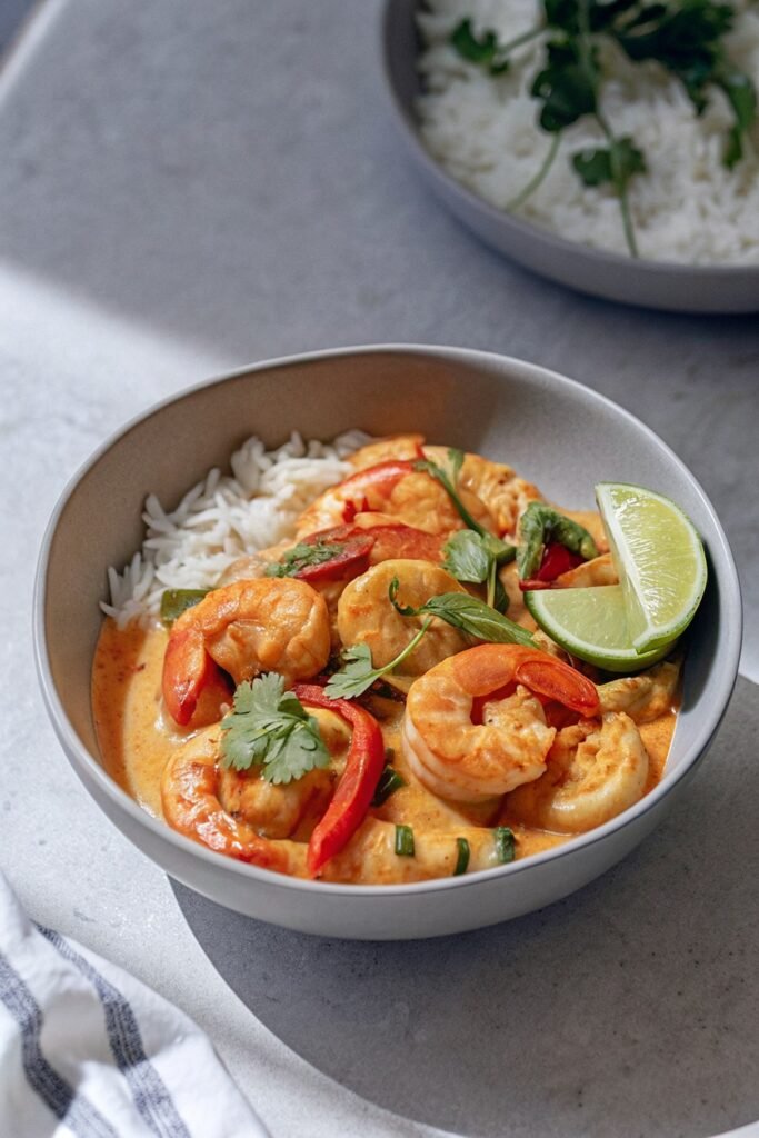 Thai coconut shrimp curry is the perfect combination of creamy, spicy, and delicious. It’s made by simmering shrimp and veggies in a coconut milk and red curry sauce, and it’s great for weeknights, dinner parties, or any day of the year.