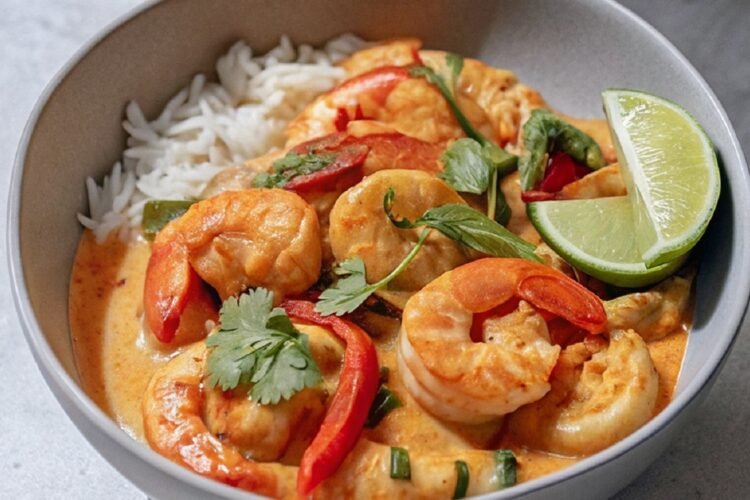 Start by rinsing the shrimp and patting them dry with a paper towel. Removing excess moisture helps them cook evenly later in the pan. Season lightly with salt and pepper and set them aside while the curry base begins cooking.