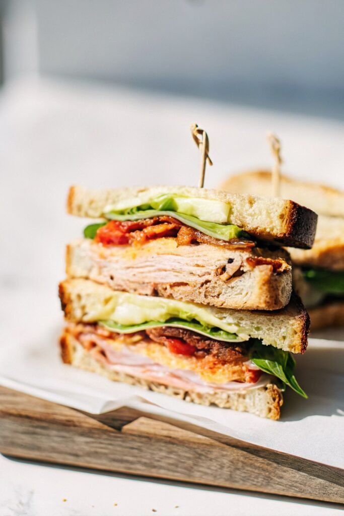 Top with the final slice of bread. Press gently to hold everything together, then insert toothpicks in each corner. Slice into triangles to create that classic club sandwich shape.