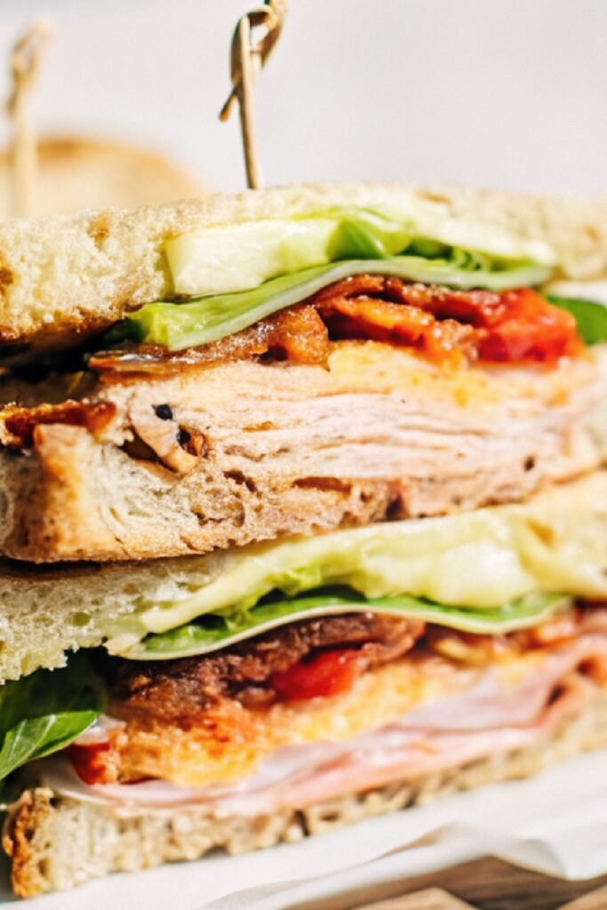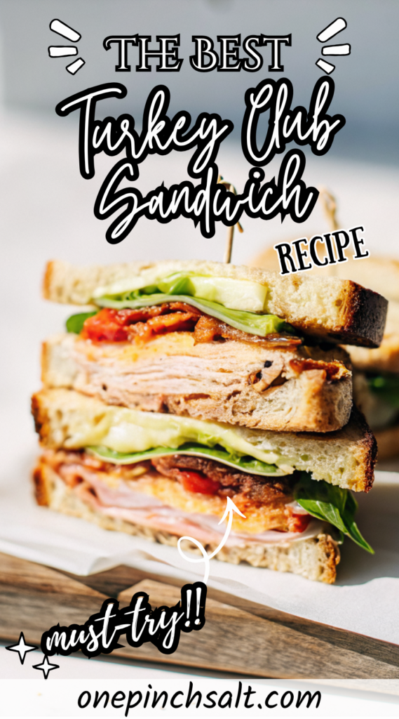 Turkey club sandwiches are completely customizable, and you can add whatever you like! My perfect combination is toasted bread with a creamy mayo spread, layers of juicy sliced turkey, crispy smoky bacon, fresh lettuce, ripe tomato slices, and a sprinkle of tangy pickles. It’s delicious and full of flavor and crunch in every bite.